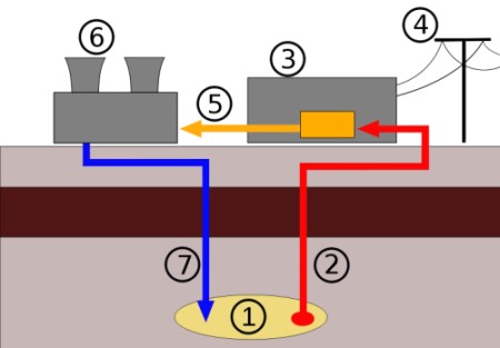 - Cold water is fed back to the cycle to be reheated by the Earth
