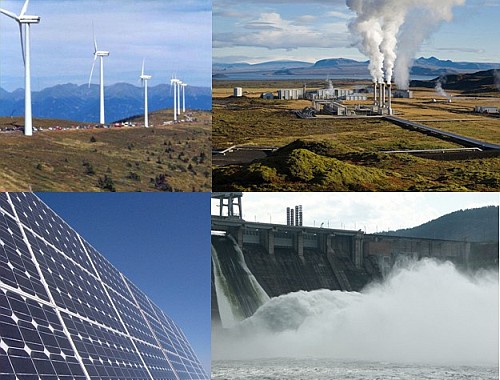 By top left: File:Tauernwindpark.jpg: Kwerdenkertop right: File:NesjavellirPowerPlant edit2.jpg: Gretar Ívarsson – Edited by Fir0002bottom left: File:Solar_Panels.jpg: Fernando Tomásbottom right: File:Krasnoyarsk hydroelectric station.jpg: vadimpl@mail.ruderivative work: OI-B-i.fernandez02[see page for license], via Wikimedia Commons