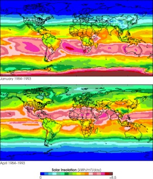 These false-color images show the average solar insolation, or rate of incoming sunlight at the Earth’s surface, over the entire globe for the months of January and April. The colors correspond to values (kilowatt hours per square meter per day) measured every day by a variety of Earth-observing satellites and integrated by the International Satellite Cloud Climatology Project (ISCCP). NASA’s Surface Meteorology and Solar Energy (SSE) Project compiled these data–collected from July 1983 to June 1993–into a 10-year average for that period.
